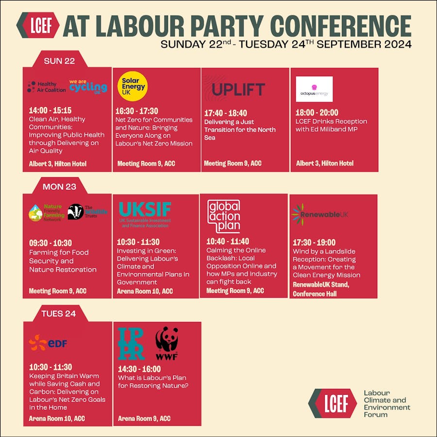 📢 LCEF has now finalised our Labour Conference fringe programme, with events spanning topics from green finance to the just transition. Ours events bring together leading politicians and policymakers, industry leaders, and others with expert knowledge and experience. Here is our programme of public events at Lab24.